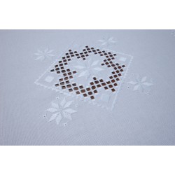 Veľký symetrický ručene vyšívaný obrus s centrálnym motívom. Úplne ideálny na štvorcové alebo okrúhle stoly, no rovnako krásne vynikne aj na veľkom stole v kombinácií s prestieraniami.